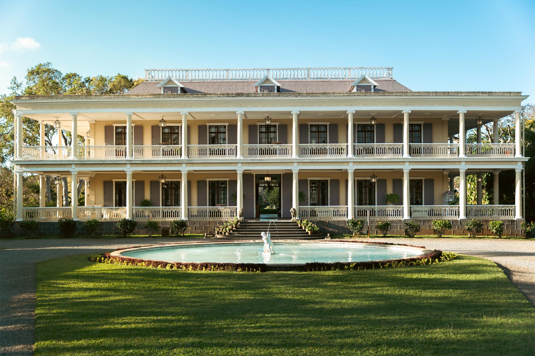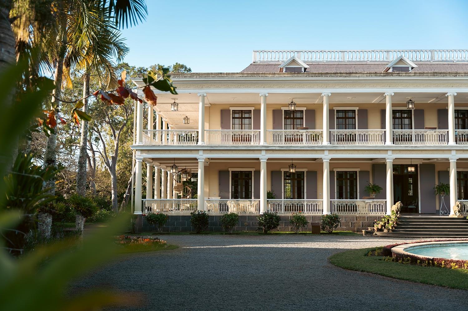 Château de Labourdonnais features typical 19th-century “Creole house” architecture, influenced by French and Mediterranean styles. Built between 1856 and 1859 with great care and inspired by Italian neoclassicism, the house spans two levels. It is surrounded by a double colonnaded gallery that provides shade and better ventilation. The house is built on a basalt stone base and primarily constructed from teak wood, with a roof covered in teak roof tiles. The layout follows the style of 19th-century townhouses, with a central hallway leading to the dining room on one side and the grand salon on the other. The bedroom is located upstairs. Traditionally, the kitchen was in a small external pavilion, which has now been converted into a conference room, the Ernest Wiehe Conference room, for meetings, seminars, and temporary exhibitions.