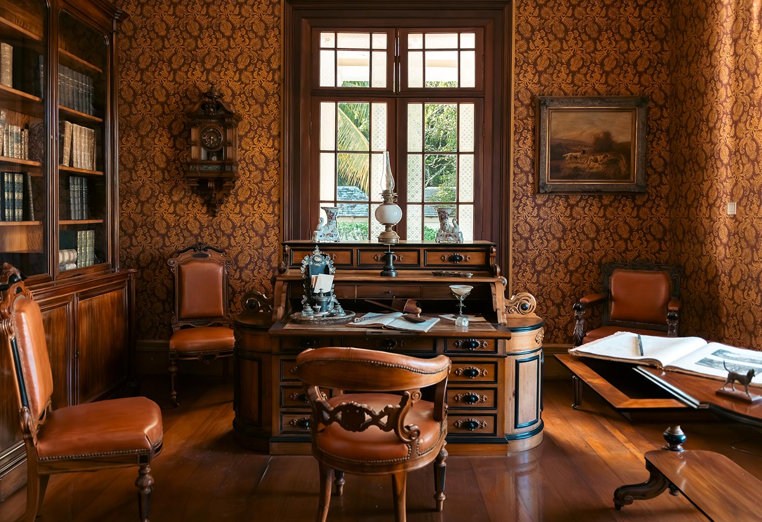 The interior décor is carefully detailed, with the owner’s monogram appearing on various items throughout the house. The dining room features Victorianstyle décor with furniture imported from Britain, while the bedroom and salon are styled with French influences, including Napoleon III chairs. The floral-patterned wallpaper originally came from the French manufacturer Jules Desfossé, and the hand-painted panoramic wallpaper is from the Alsace-based workshop of Jean Zuber.